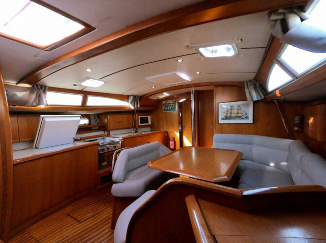 Sun Odyssey 45 is powered by a 75 hp engine, ensuring a smooth and comfortable sailing experience. The safety net provides peace of mind for families with small children.