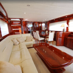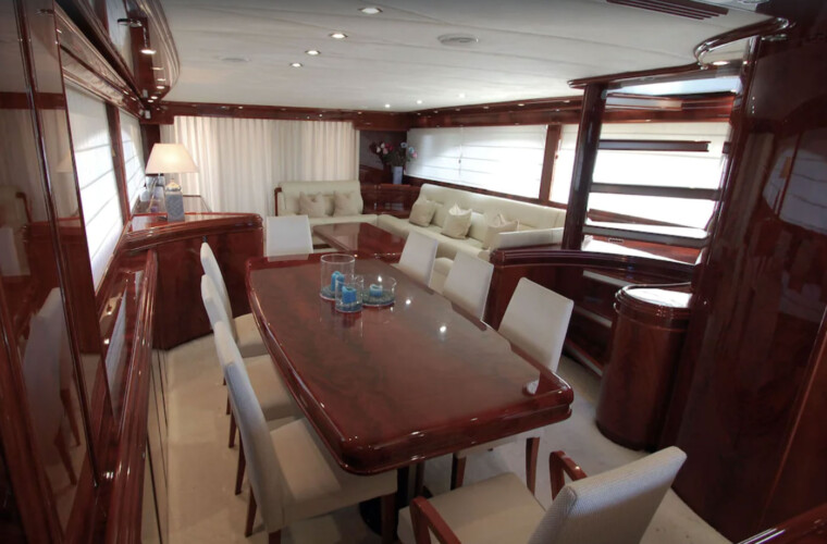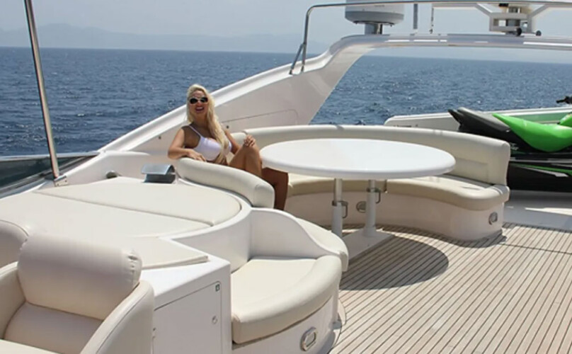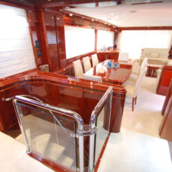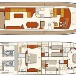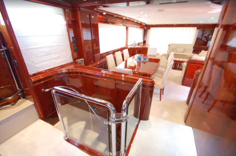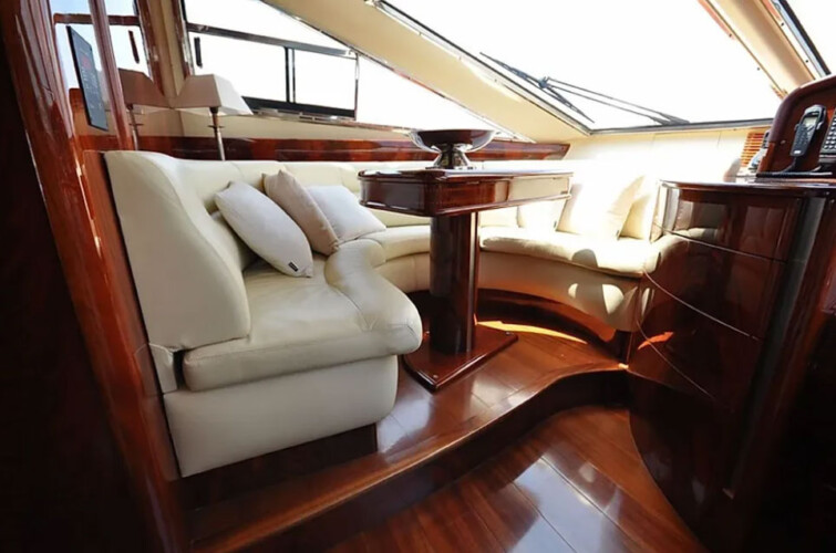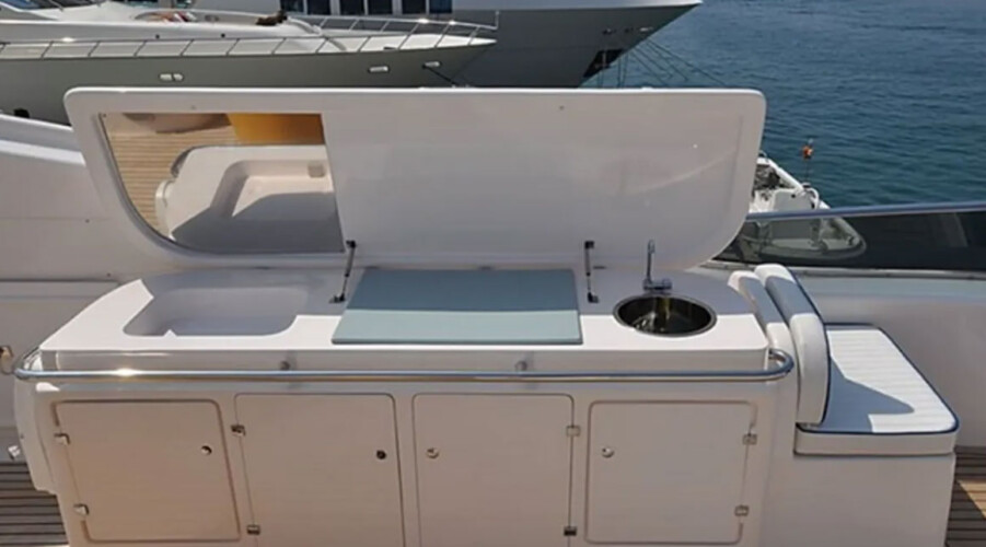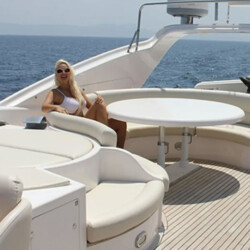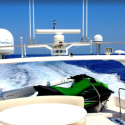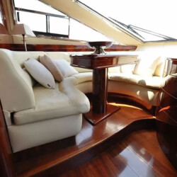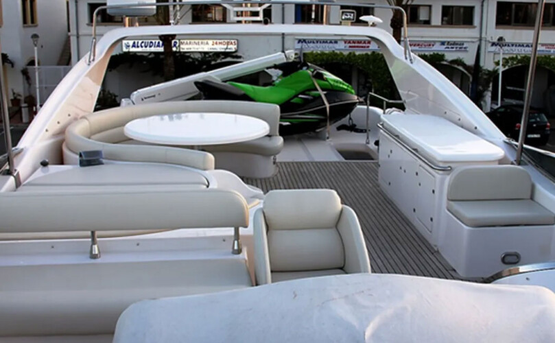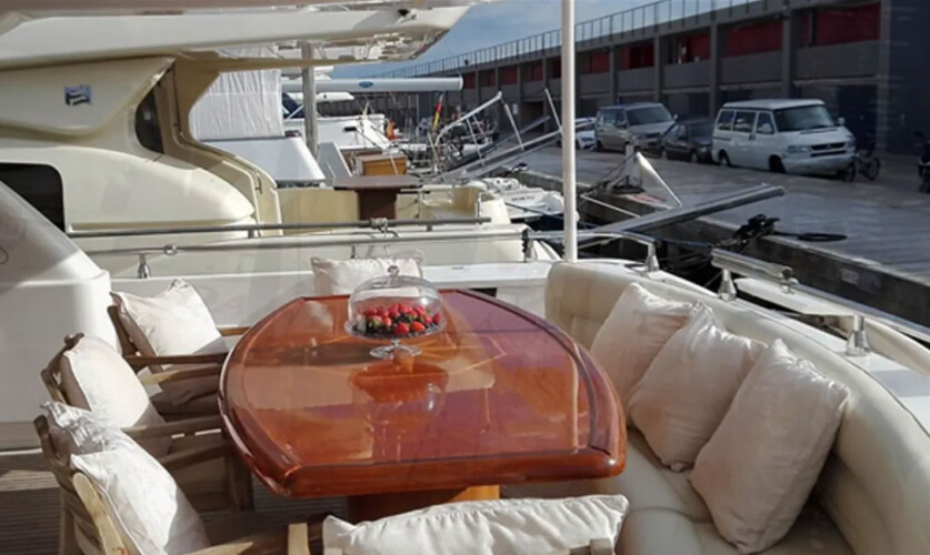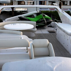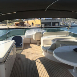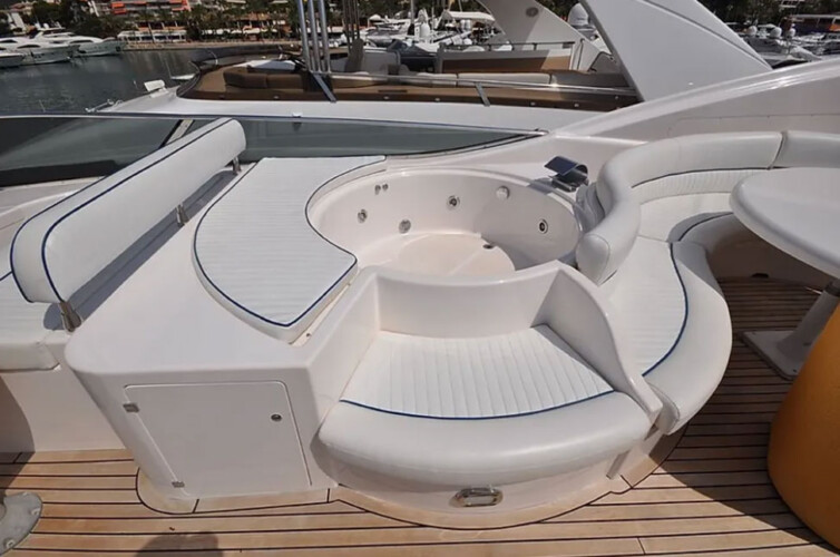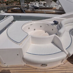 Ascend to the top deck, where the flybridge awaits with a plush sofa and table, inviting you to unwind and enjoy the breathtaking panoramic views. To top it off, a luxurious jacuzzi offers the perfect spot to rejuvenate, while a convenient sun awning ensures comfort throughout the day.