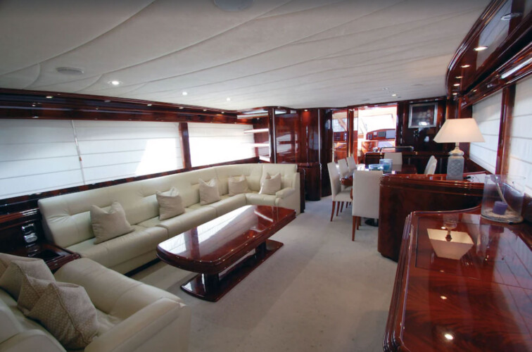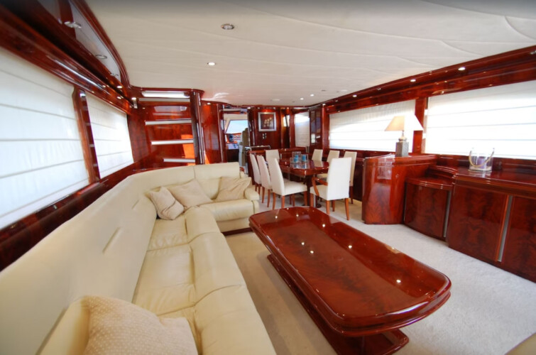 The middle deck showcases a semi-open cockpit in the stern, complete with a cozy sofa and table, setting the stage for alfresco dining or leisurely conversations. Step inside to find a sprawling salon with two distinct seating areas, perfect for socializing, relaxing, or simply admiring the view. The adjacent galley, located near the captain's bridge, is fully equipped to cater to your culinary needs. At the bow, indulge in sunbathing areas designed for ultimate relaxation and soaking in the sun's rays.