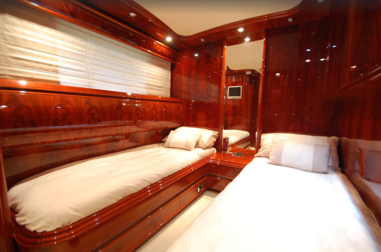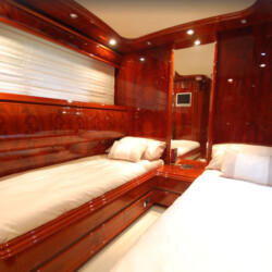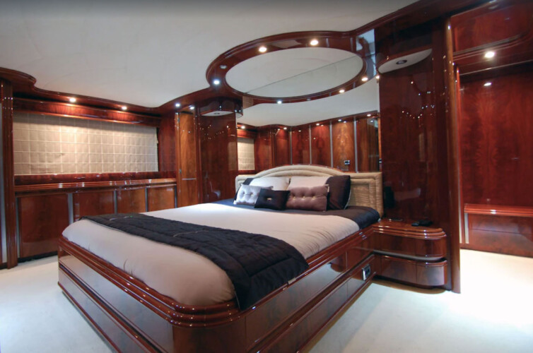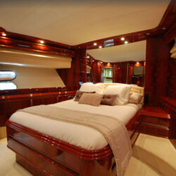 Stepping aboard the Astondoa 82 GLX, you'll be greeted by three spacious decks, thoughtfully designed to cater to your every desire. The lower deck boasts four double cabins, each featuring its own private bathroom for ultimate privacy and convenience. Two cabins offer sumptuous double beds, while the other two provide versatile twin beds. The opulent mahogany interiors create a warm and inviting atmosphere, enveloping you in the lap of luxury.