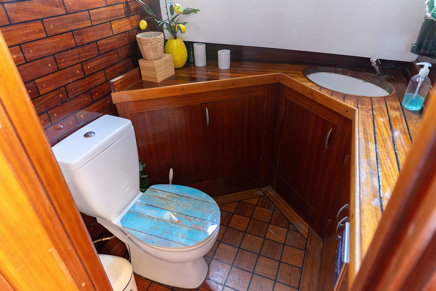 The Karya gulet features three spacious decks. The lowermost deck houses a cozy cabin, while the middle main deck offers a comfortable foredeck with a sofa. Step into the large saloon to find ample seating, tables, and large windows that provide breathtaking panoramic views. The galley in the saloon is perfect for preparing meals and refreshments for your guests. The aft section hosts an open terrace with sofas on both sides and tables, creating a welcoming space for socializing and relaxation.