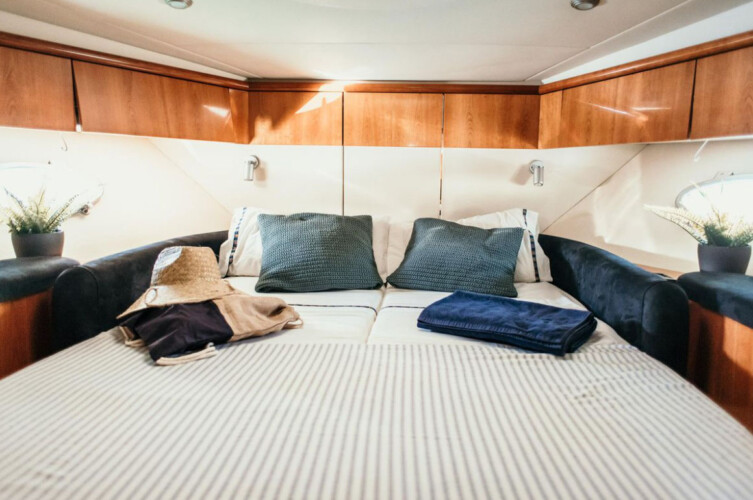 The yacht is made of high-quality materials and has an exquisite author's design and state-of-the-art equipment. The upper semi-open deck with panoramic glazing is equipped with a soft seating area and a table. The lower enclosed deck is designed in strict business tones, equipped with beige leather sofas, various work surfaces, bathrooms, and cabins. The yacht has a galley equipped with all the necessary inventory, which allows you to prepare meals for any number of people. One of the advantages of this boat is the presence of comfortable 3 cabins, which can comfortably accommodate up to 6 people.