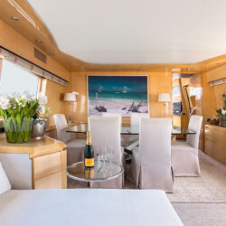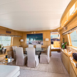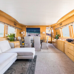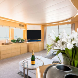 La cubierta principal cuenta con un amplio salón con acceso a la terraza. Aquí también está el puesto de control, separado del espacio principal. En la zona de relax se pueden alojar hasta 12 personas simultáneamente. La cocina está equipada con un lavavajillas, un horno de microondas combinado, una estufa y un refrigerador. Valiosas especies de madera se utilizan en el acabado, la decoración y los elementos del mobiliario.