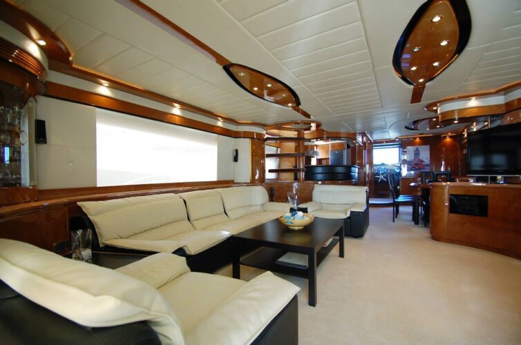 El espacioso y luminoso salón del Mochi Craft Mega 25 ofrece un ambiente cómodo y acogedor para relajarse y conversar. Con grandes ventanales, el salón se llena de luz natural y brinda excelentes vistas de los paisajes marinos circundantes. El mobiliario elegante, la iluminación tenue y los materiales de alta calidad, como la rica madera de secuoya, el cuero y las lujosas telas, crean un ambiente cálido y sofisticado. Para el entretenimiento, el salón también está equipado con un televisor.