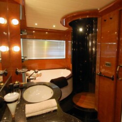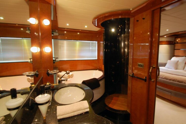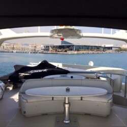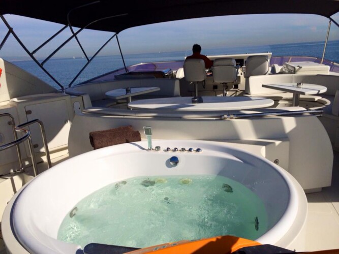 El flybridge del Mochi Craft Mega 25 es realmente impresionante, con un jacuzzi, cómodos sofás y una mesa, proporcionando un espacio ideal para socializar, tomar el sol o disfrutar de un refrescante chapuzón en el jacuzzi. Esta zona elevada ofrece impresionantes vistas panorámicas de las aguas circundantes y se puede acceder tanto desde el salón como desde la terraza semiabierta en la popa. Hay una sombrilla disponible en el flybridge, lo que garantiza que los huéspedes se sientan cómodos incluso en los días más soleados.