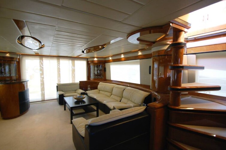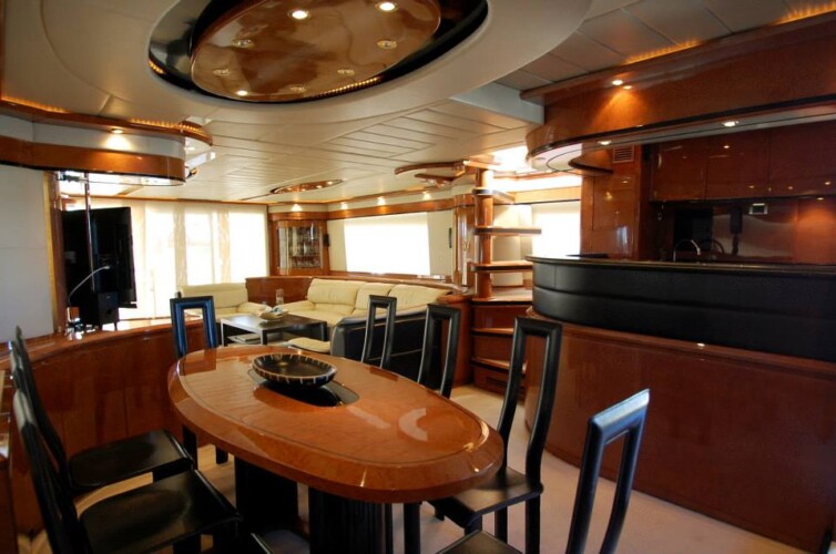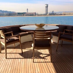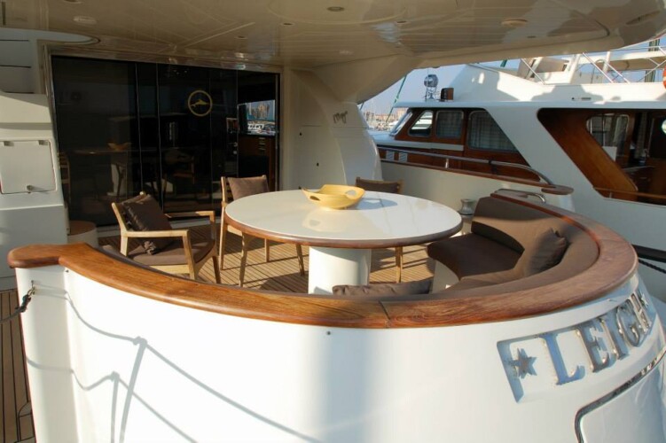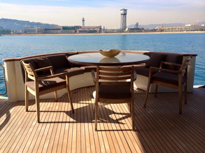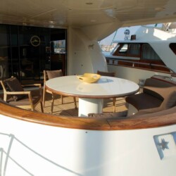 Al salir del salón, encontrará una terraza semiabierta en la popa de la cubierta principal. Esta área brinda espacio adicional para la relajación, con cómodos sofás, sillas y una mesa de café, donde los huéspedes pueden disfrutar de comidas al aire libre y cócteles, o simplemente disfrutar del hermoso entorno.